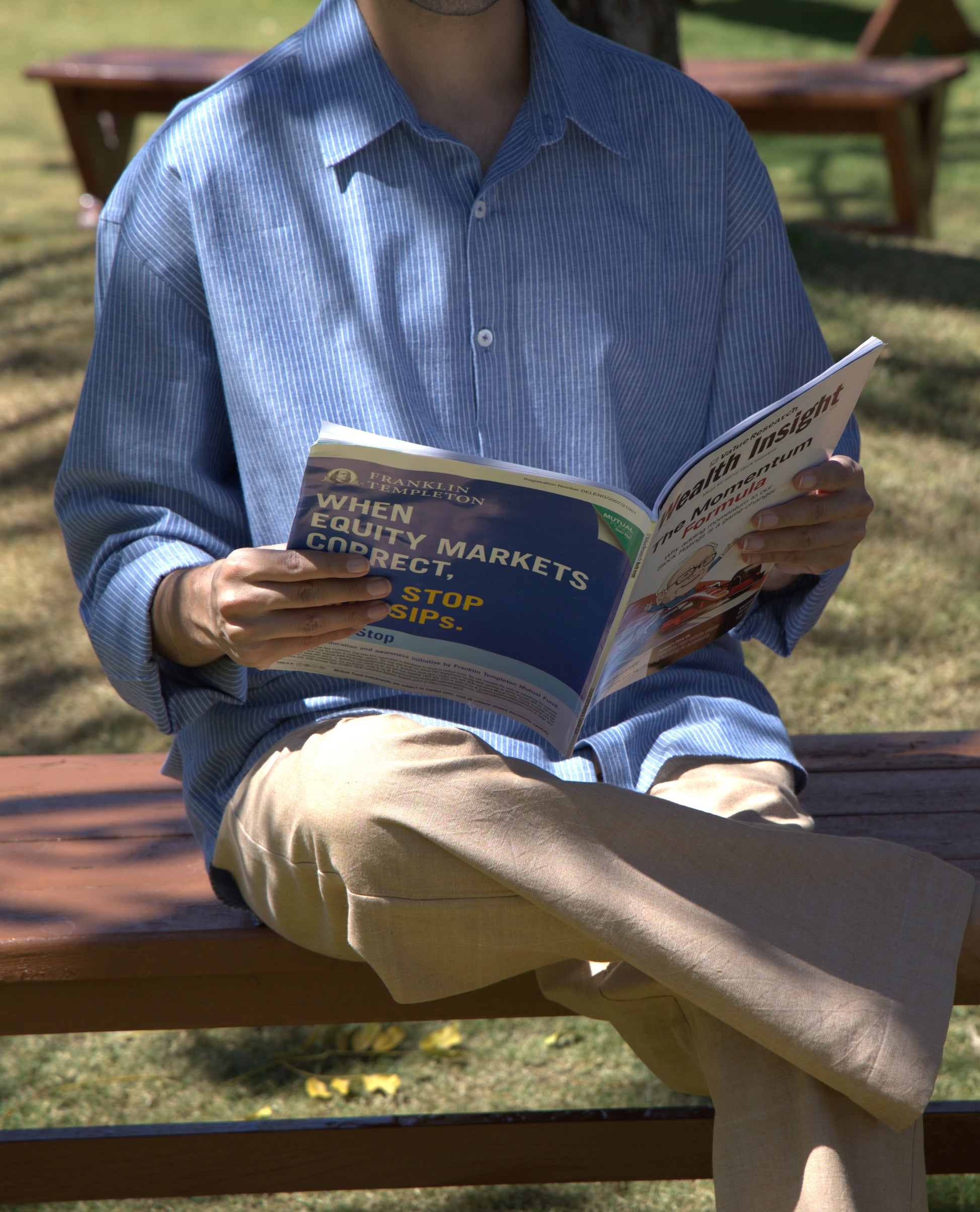 Men’s 100% organic cotton shirt with a relaxed fit, full-length sleeves, and a slight dropped shoulder. Mélange Blue with thin stripes of undyed yarn. The model is 5'11" and is wearing a size 'M' shirt.
