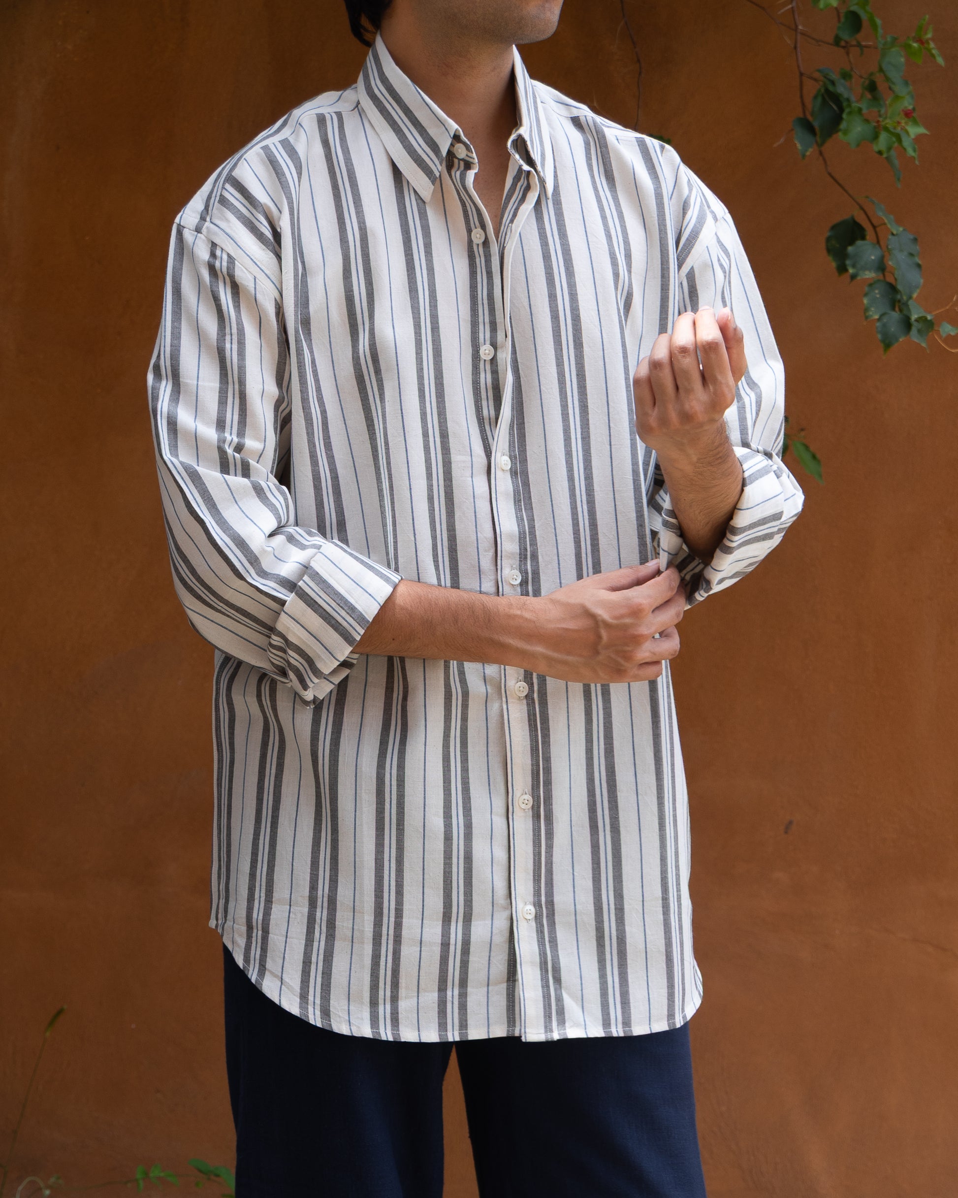 Men's 100% organic cotton relaxed-fit shirt inspired by oversized styles — easy, but not baggy. Not for those seeking a regular fit, this one's made for laid-back look with dropped shoulder and full length sleeves. Wide stripes emerge from yarns dyed in Kasim, a time-honored fermentation of rusted iron, jaggery, and water. The process yields bold, earthy black stripes with a depth and character that feel both raw and refined. Model is 5'11" and is wearing a size 'M' shirt.
