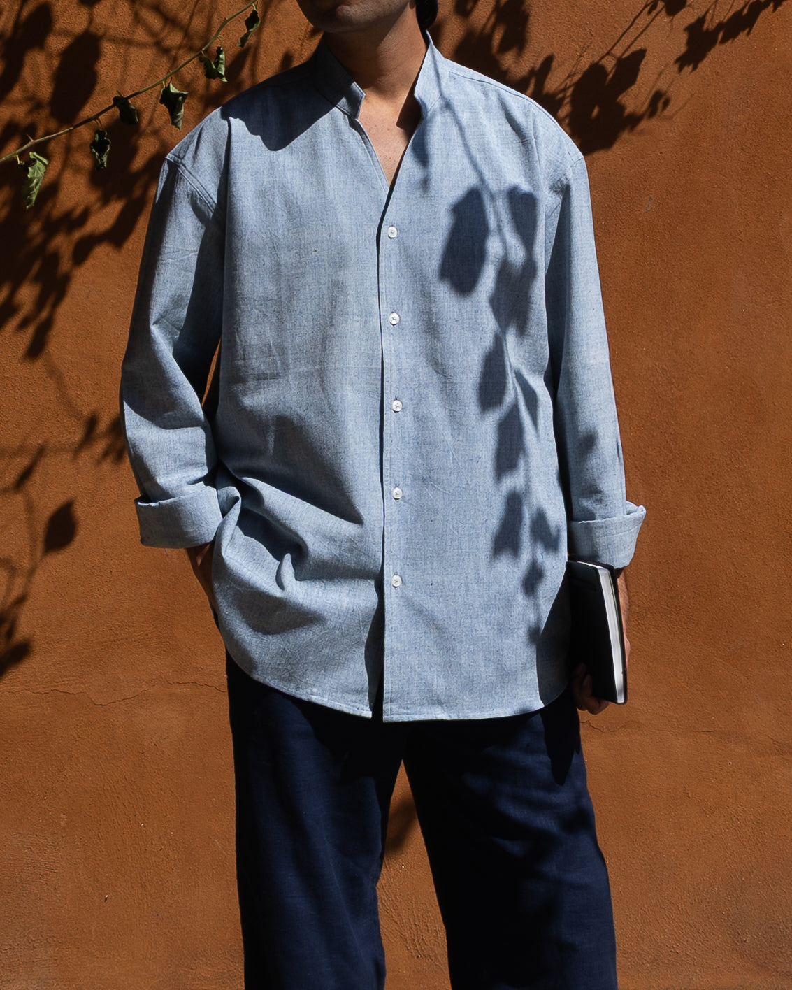 A fresh take on the shirt — V-neck meets stand collar, creating a look that’s minimal, modern, and effortlessly refined. The model is 5'11 and is wearing a size 'M' shirt.