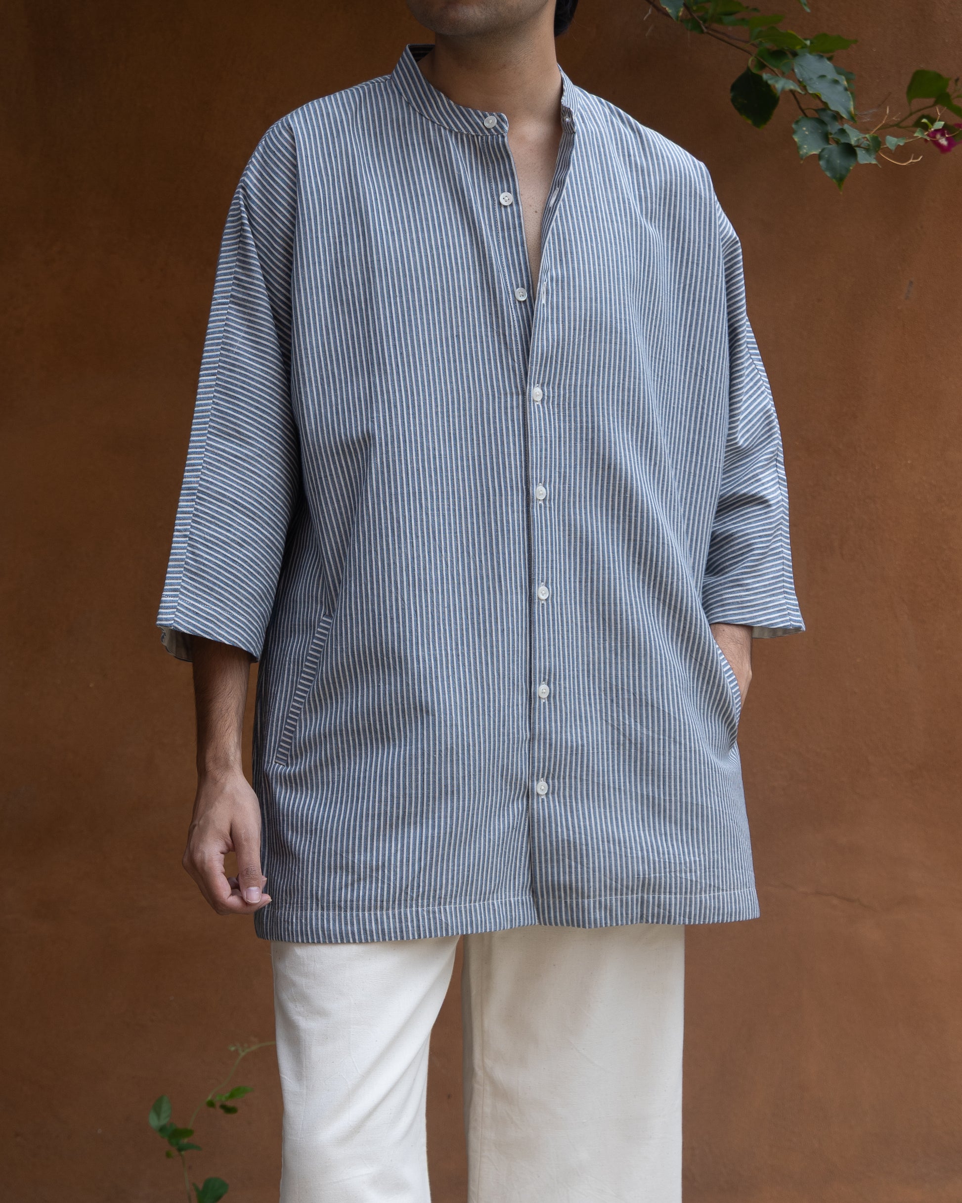 Men's 100% organic cotton shirt, inspired by traditional Japanese kimonos, featuring an A-line cut, 3/4 sleeves, and a shoulder-free design. The stripes are crafted using natural Indigo and Kasim, where the yarns are slowly fermented in a blend of rusted iron, jaggery, and water—an age-old process that brings out deep, earthy hues. The model is 5'11" and is wearing a size 'M' shirt.