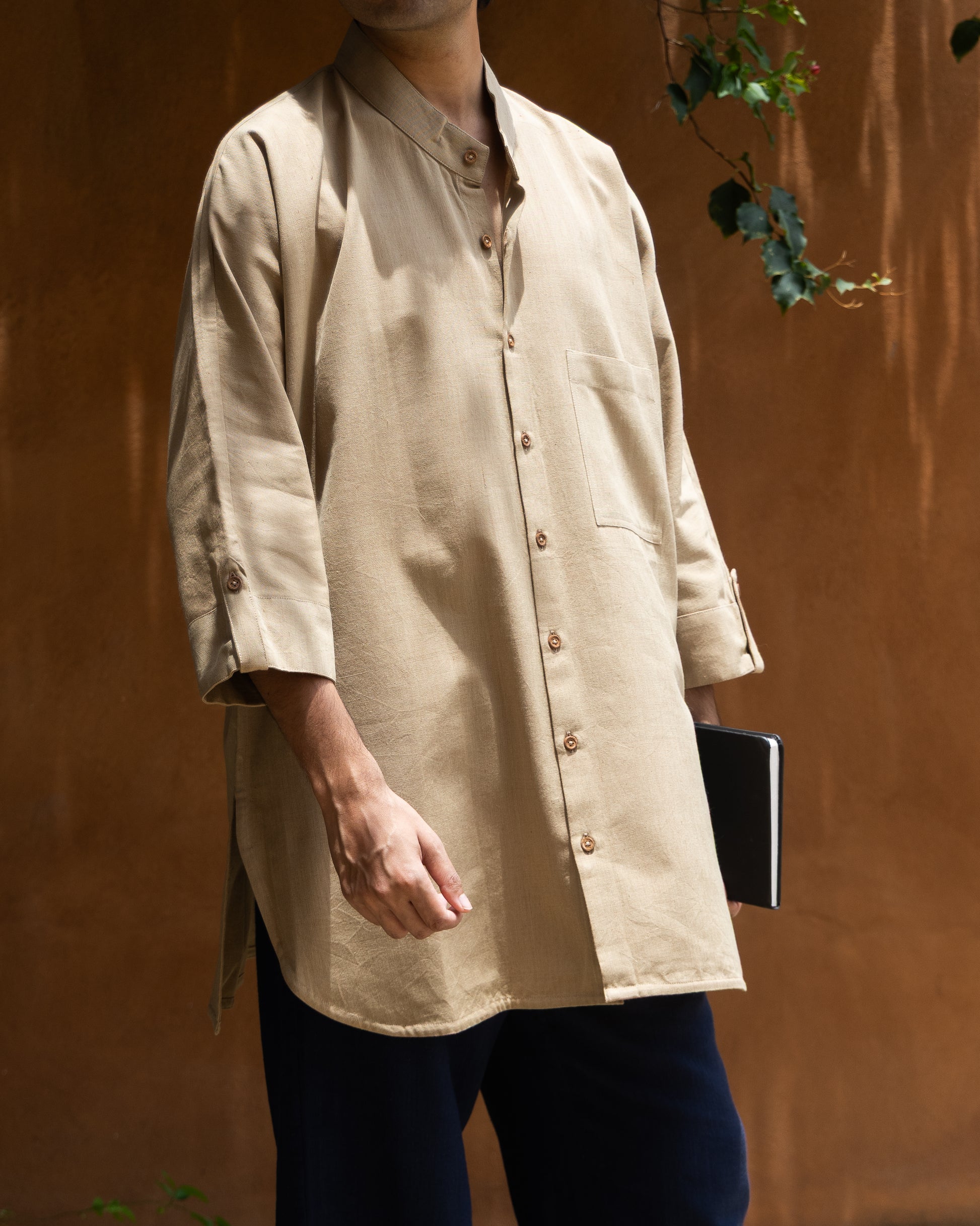 Crafted from 100% organic cotton, this men’s shirt draws inspiration from traditional Japanese kimonos. It features a longer silhouette than our classic kimono shirts, 3/4th sleeves with a subtle self-fold detail, gently curved hems, and a relaxed, shoulder-free design for an effortlessly laid-back look. Arecanut-dyed yarns blended with soft ecru create a grounded, earthy shade of khaki — a tone that feels raw yet timeless. The model is 5'11" and is wearing a size 'M' shirt.