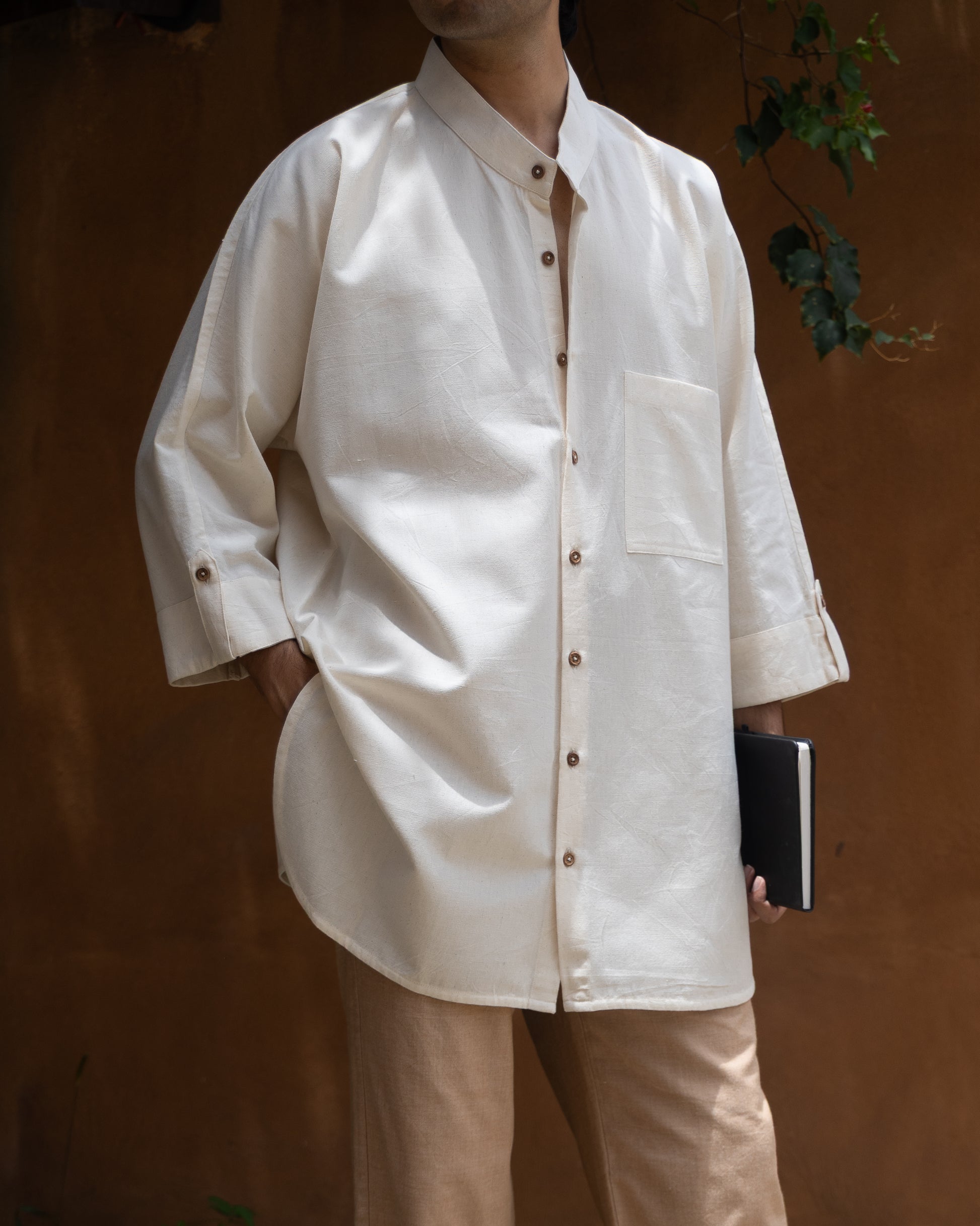 Crafted from 100% organic cotton, this men’s shirt draws inspiration from traditional Japanese kimonos. It features a longer silhouette than our classic kimono shirts, 3/4th sleeves with a subtle self-fold detail, gently curved hems, and a relaxed, shoulder-free design for an effortlessly laid-back look. Crafted from undyed and unbleached raw yarns, preserving the fabric’s natural beauty and texture. The model is 5'11" and is wearing a size 'M' shirt.