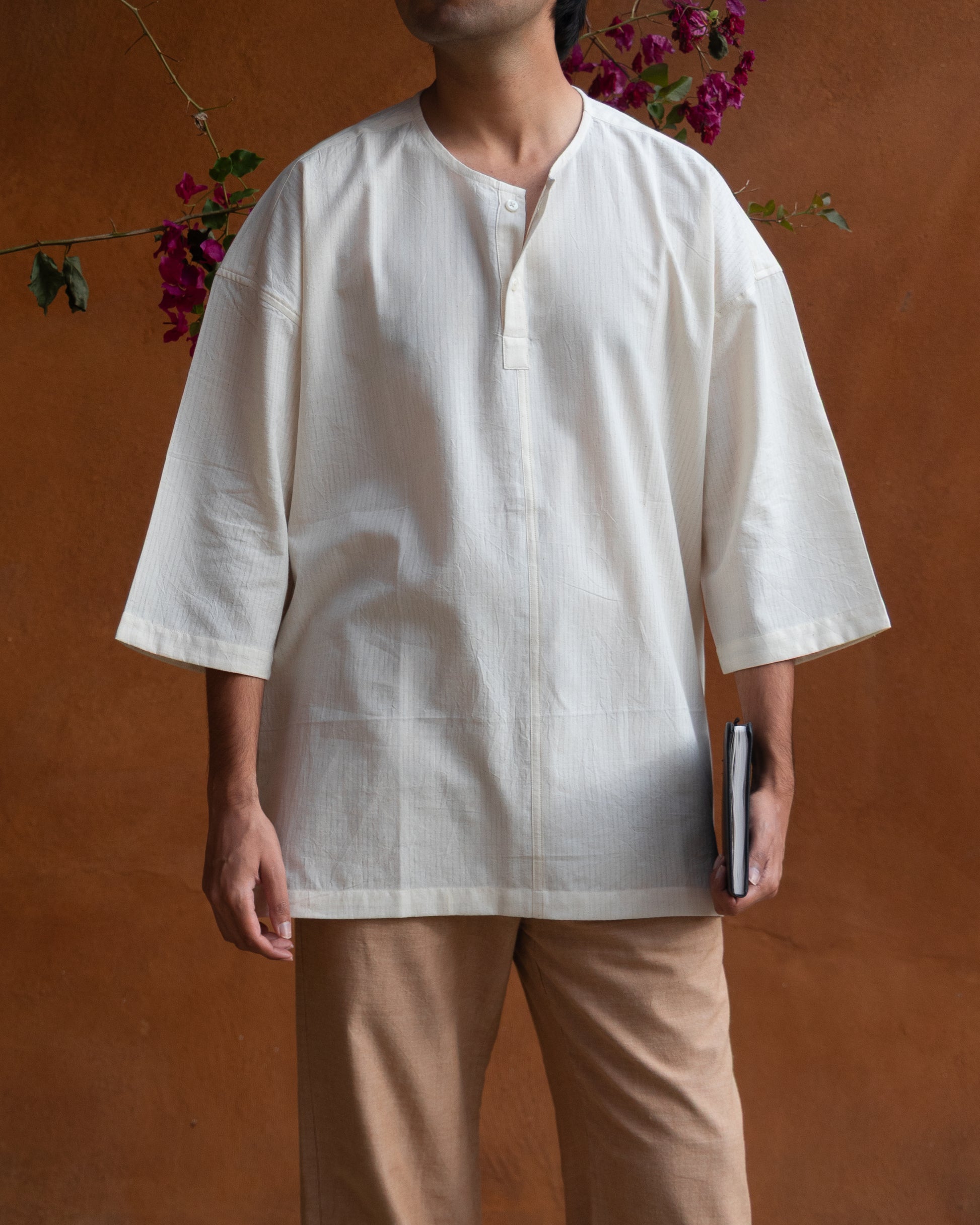 A shirt inspired by Japan’s street fashion — long half sleeves, a short placket, and fine center stitching bring quiet character. Cut in a loose, relaxed fit for effortless comfort. The model is 5'11 and is wearing a size 'M' shirt.
