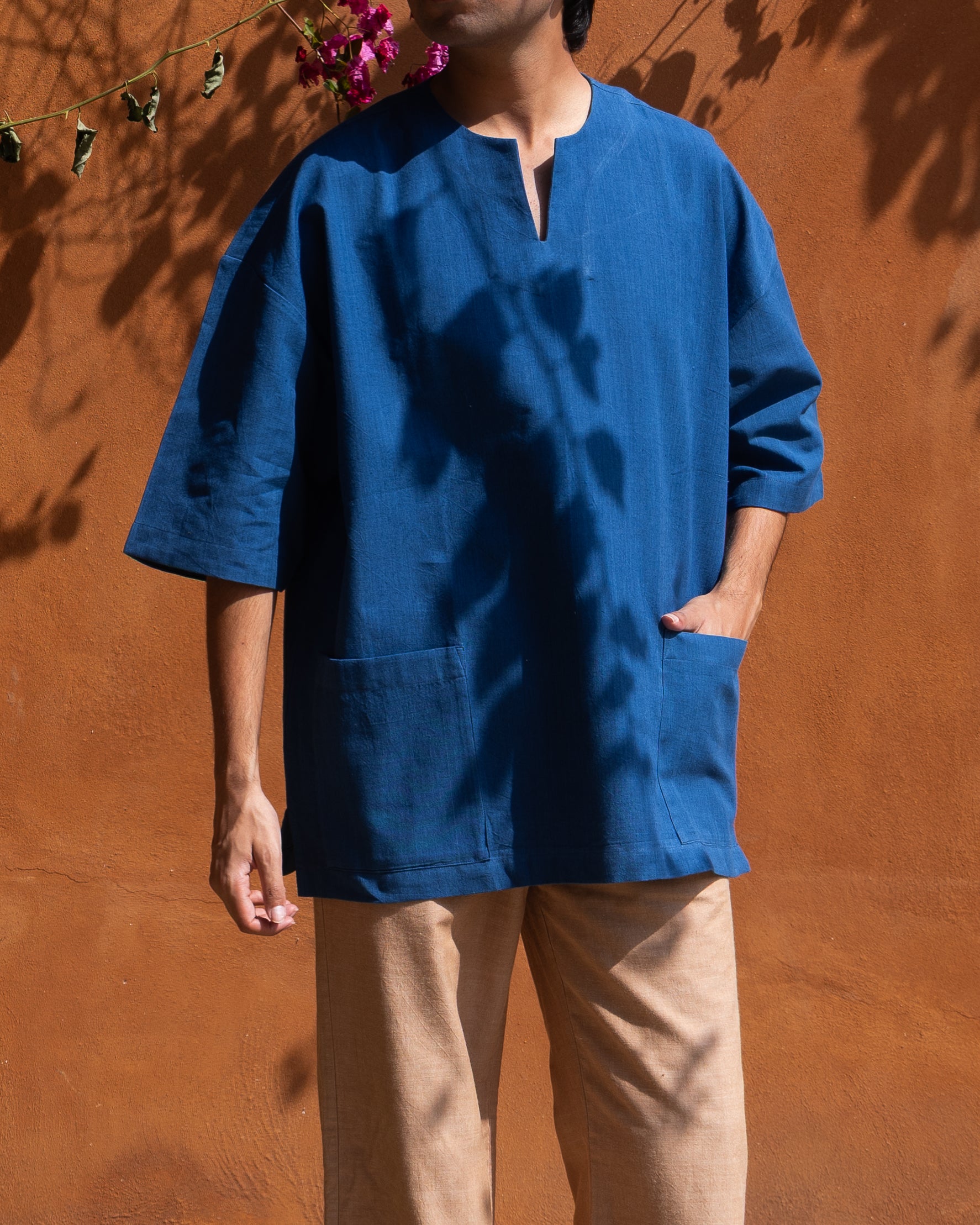 Inspired by Japanese minimalism — longer half sleeves, no placket, bottom patch pockets, and a refined neckline cut come together in a relaxed silhouette built for ease and character. The model is 5'11 and is wearing a size 'M' shirt.