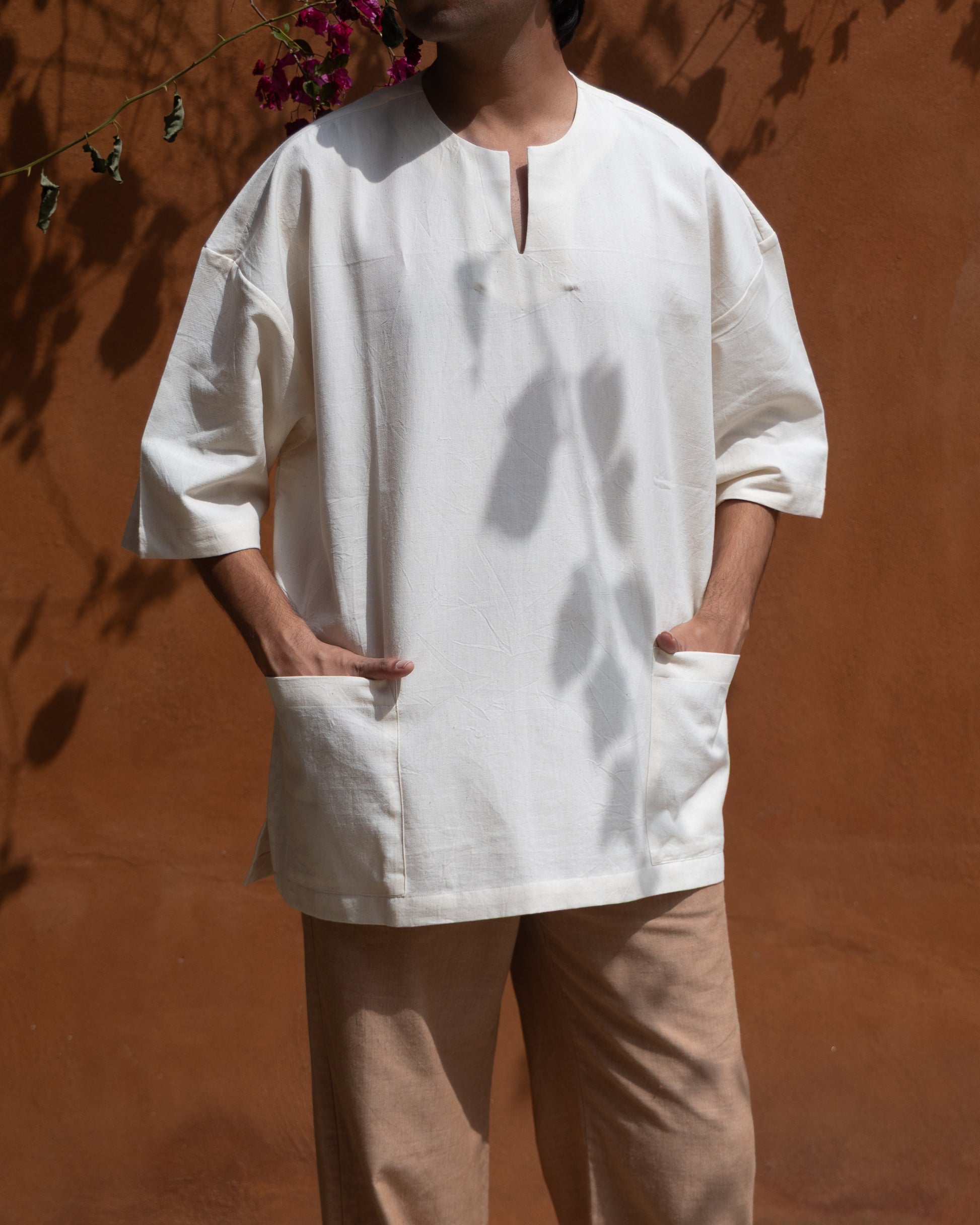 Inspired by Japanese minimalism — longer half sleeves, no placket, bottom patch pockets, and a refined neckline cut come together in a relaxed silhouette built for ease and character. The model is 5'11 and is wearing a size 'M' shirt.